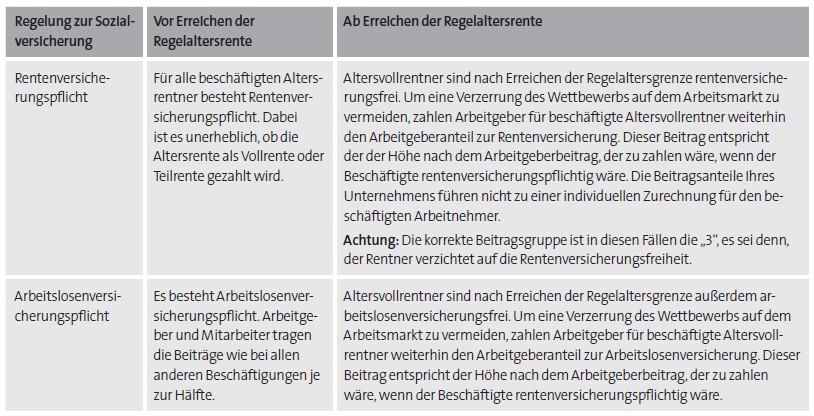 In der Kranken- und Pflegeversicherung sind alle Rentner, die eine Tätigkeit über einen Minijob hinaus ausüben, versicherungspflichtig. Die Beiträge sind von Ihrem Unternehmen und dem Mitarbeiter je zur Hälfte zu tragen. Die Versicherungspflicht als Arbeitnehmer geht der als Rentner vor. Die Beitragspflichten aus der Rente und dem Arbeitsentgelt bestehen nebeneinander.