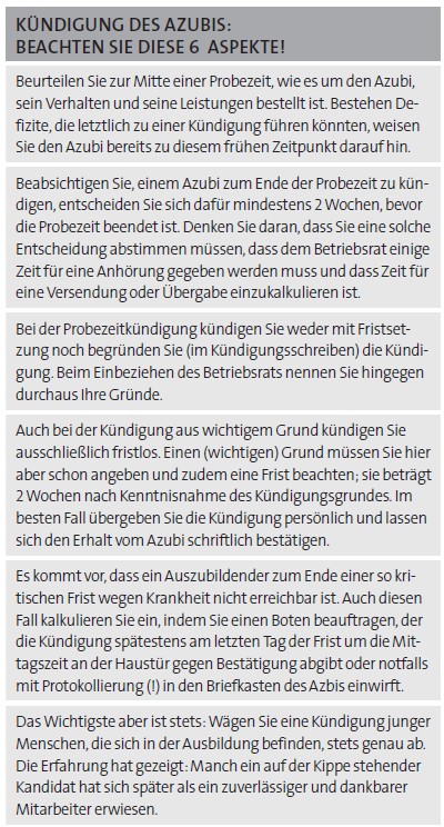 Sie muss innerhalb der – in der Ausbildung maximal 4-monatigen – Probezeit beim Auszubildenden ankommen. Auch hier genügt das rechtzeitige Absenden nicht. Verpassen Sie den Termin, dann müssen Sie einen wichtigen Grund für die Kündigung benennen können. Während der Probezeit müssen Sie hingegen keinen Grund angeben.