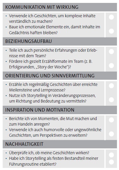 Damit Storytelling keine einmalige Aktion ist, sondern Teil Ihrer Führungskultur wird, hilft ein regelmäßiger Selbstcheck. Verwenden Sie diesen Test öfter, um auszuloten, wie fest Storytelling in Ihrem Führungsalltag verankert ist. Wenn Sie vor einer schwierigen Kommunikationssituation stehen, ist der Test nützlich, um zu überlegen, wie Sie Storytelling konkret einbauen können.